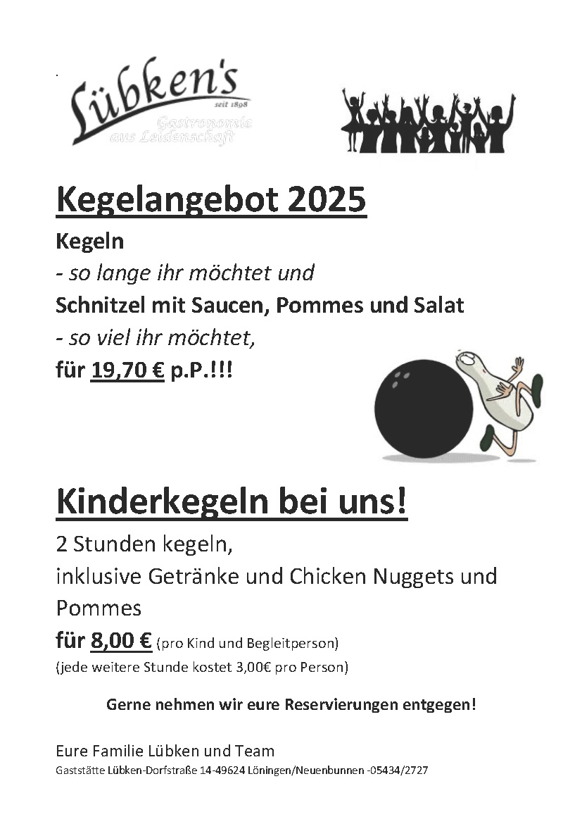 Die Gaststätte Lübken stellt fünf Bundeskegelbahnen für Sie bereit, eine Doppelkegelbahn und drei Einzelbahnen.